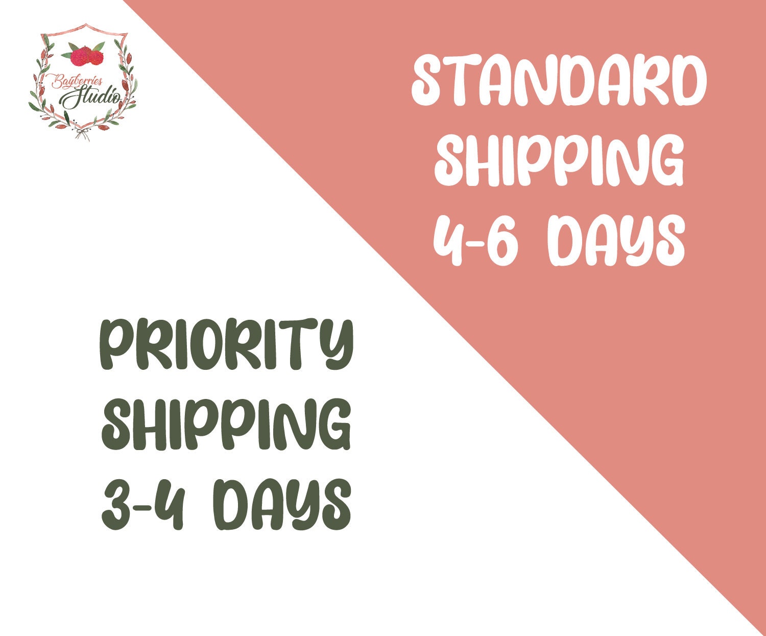 • Processing time is 1-2 days. Standard shipping is 4-6 days, Priority shipping is 3-4 days in the US. USPS shipping times are estimated and cannot be guaranteed.