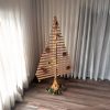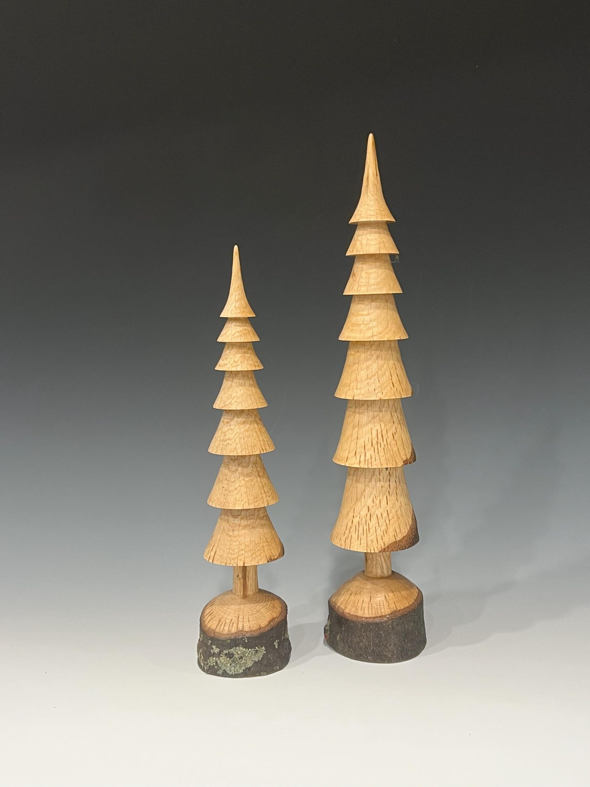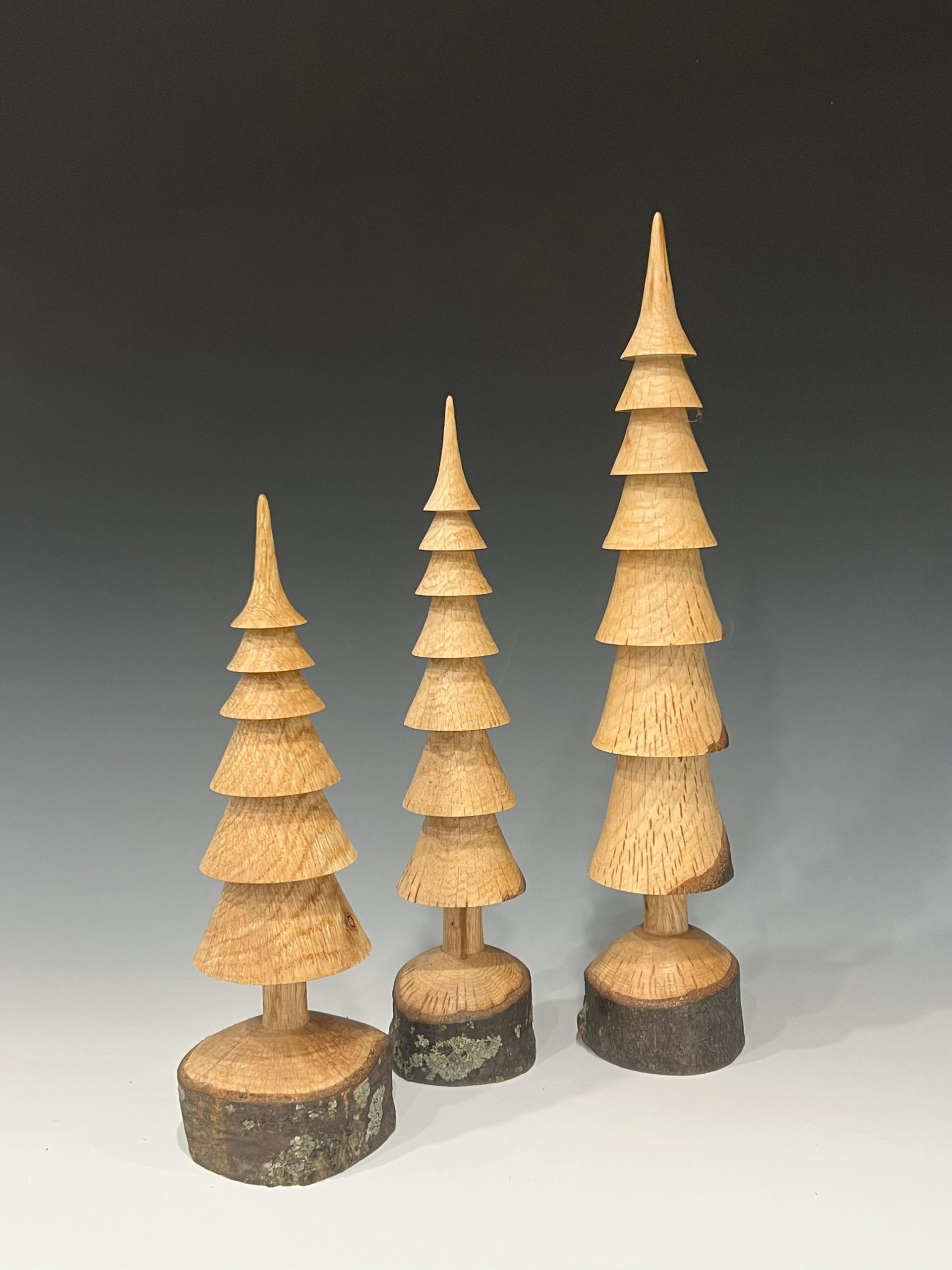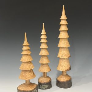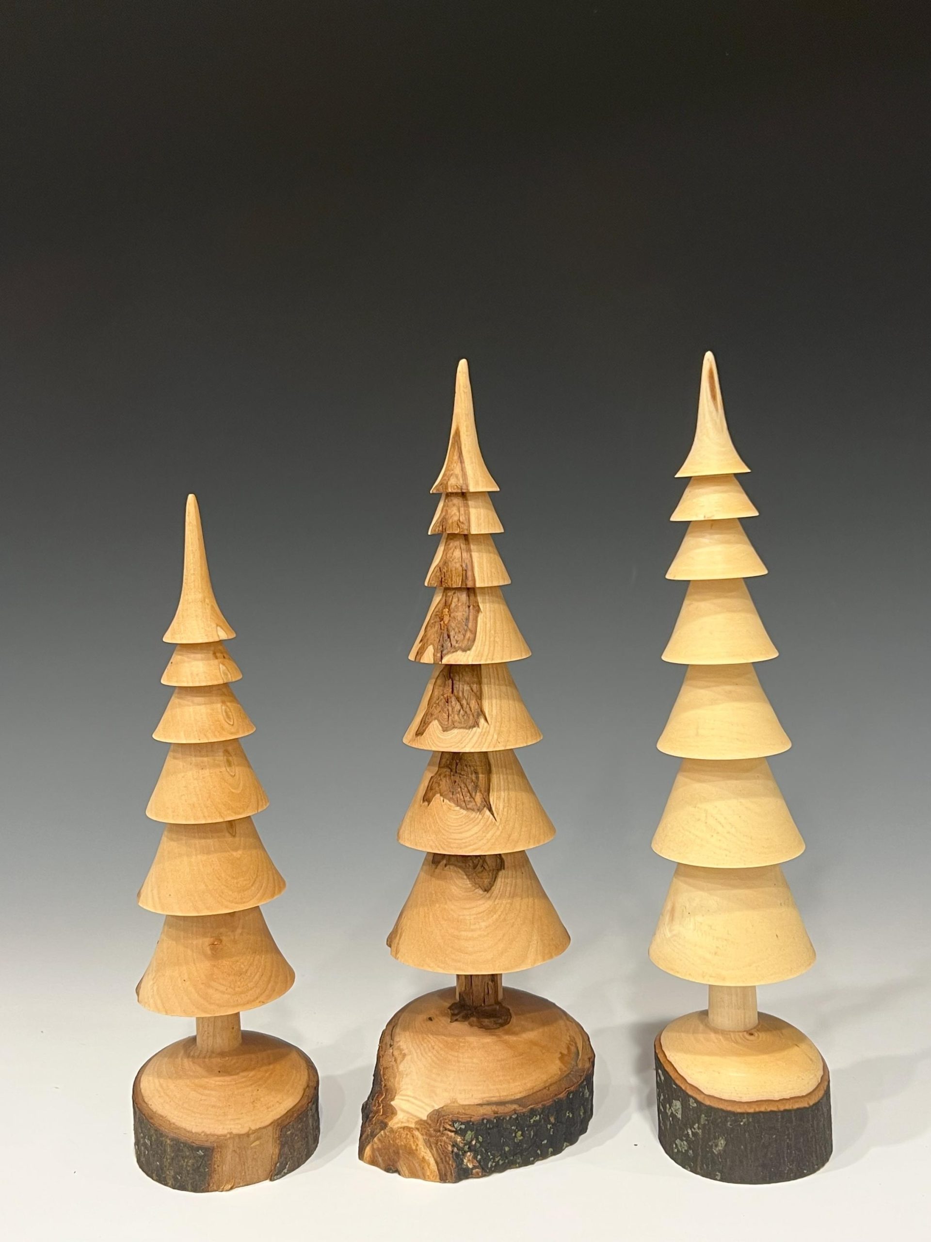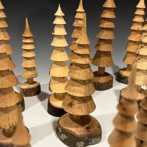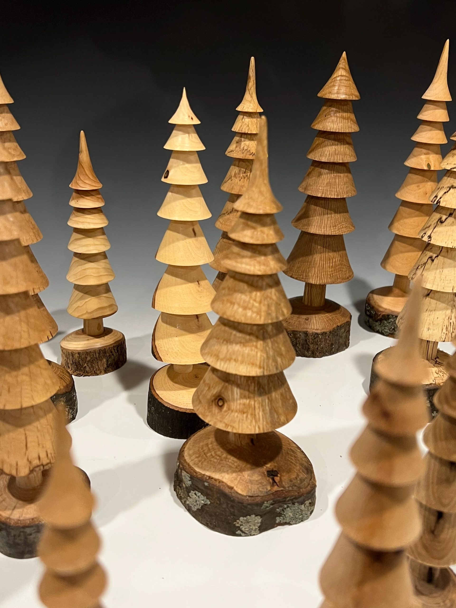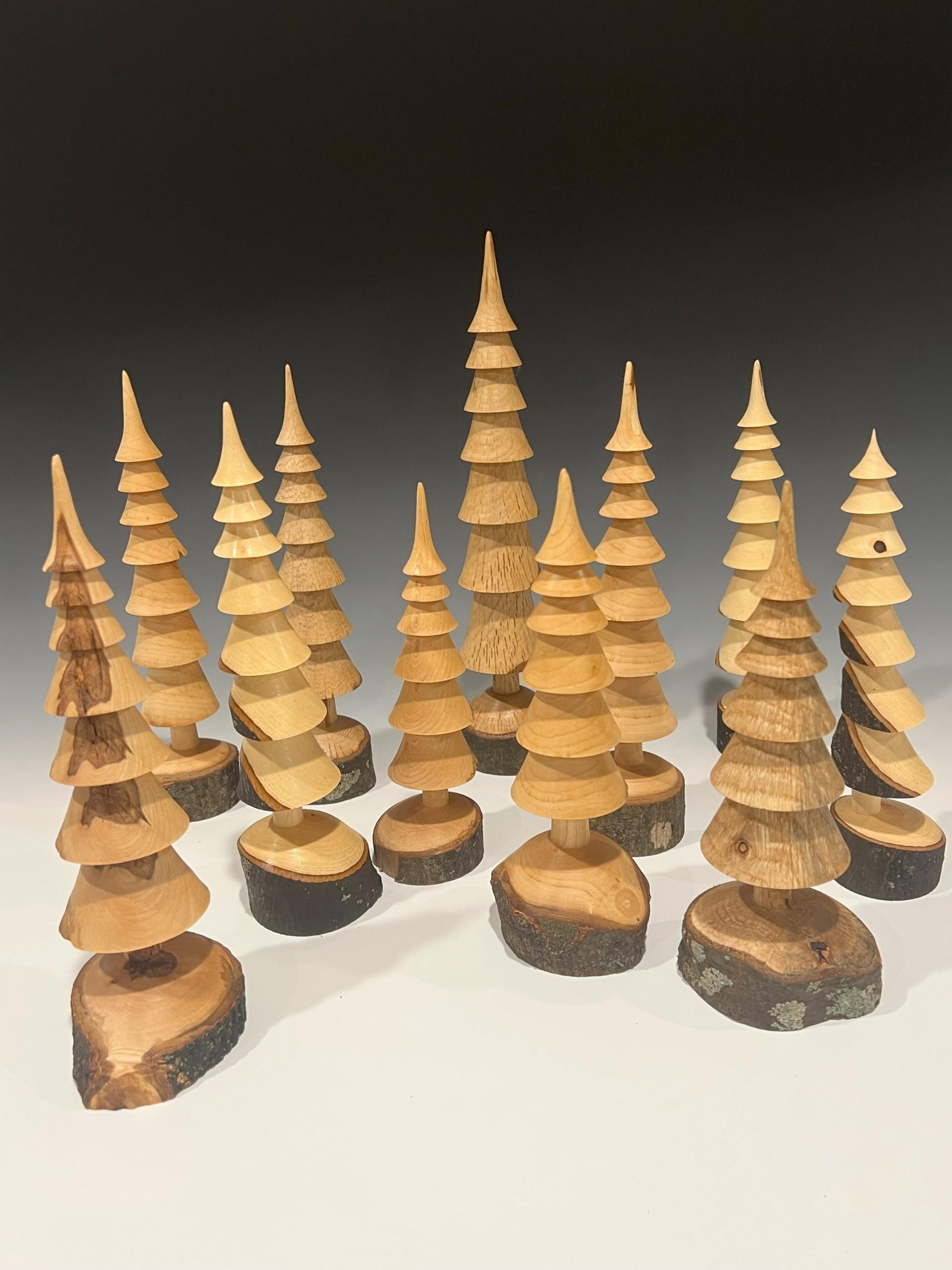 Hand turned Christmas trees in several types of wood showing various wood grains and patterns that occur naturally in the branches. Each tree is turned from a single branch and the base is live edge wood. Just as in the forest, each tree is unique.